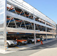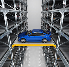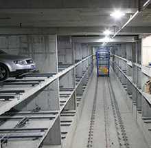巷道堆垛類自動停車系統是應用了堆垛倉儲技術,堆垛機通過在巷道內水平運動的同時完成的垂直升降,一套堆垛機覆蓋不同停車層 的每一個車位,實現XY軸同時運動。駕駛員只需要將車輛停放在停車平臺,系統將安全的把車停放在立體的停車位。巷道堆垛適用 于場地較短但對停車密度要求高的場地。巷道堆垛是所有自動停車系統中經濟性較高的產品。